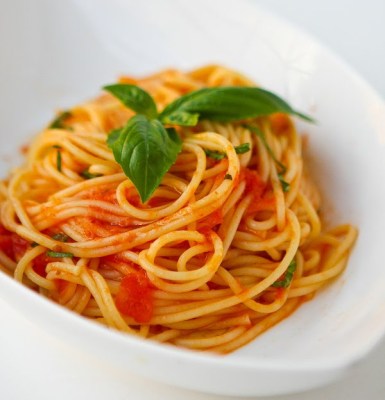 Bring a large pot of salted water to a boil. Cook the spaghetti until just shy of al dente. Drain pasta, reserving a little of the cooking water. Add pasta to sauce and cook over medium-high heat, gently tossing the pasta and the sauce together with a couple of wooden spoons until pasta is just tender. If the sauce seems a little thick, add some of the reserved pasta water. Take pan off heat and toss in butter, basil and cheese. Serve immediately. Serves 4.