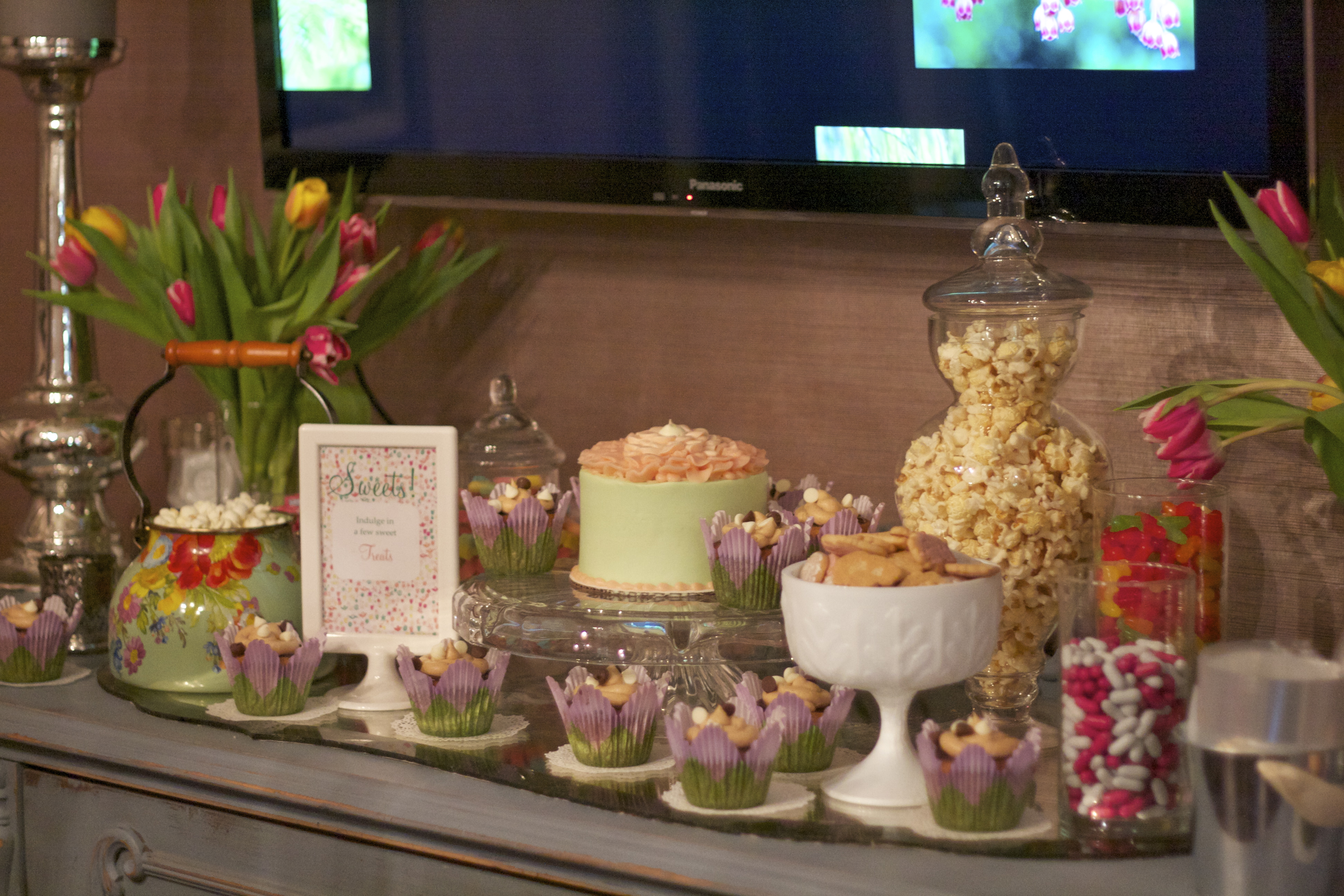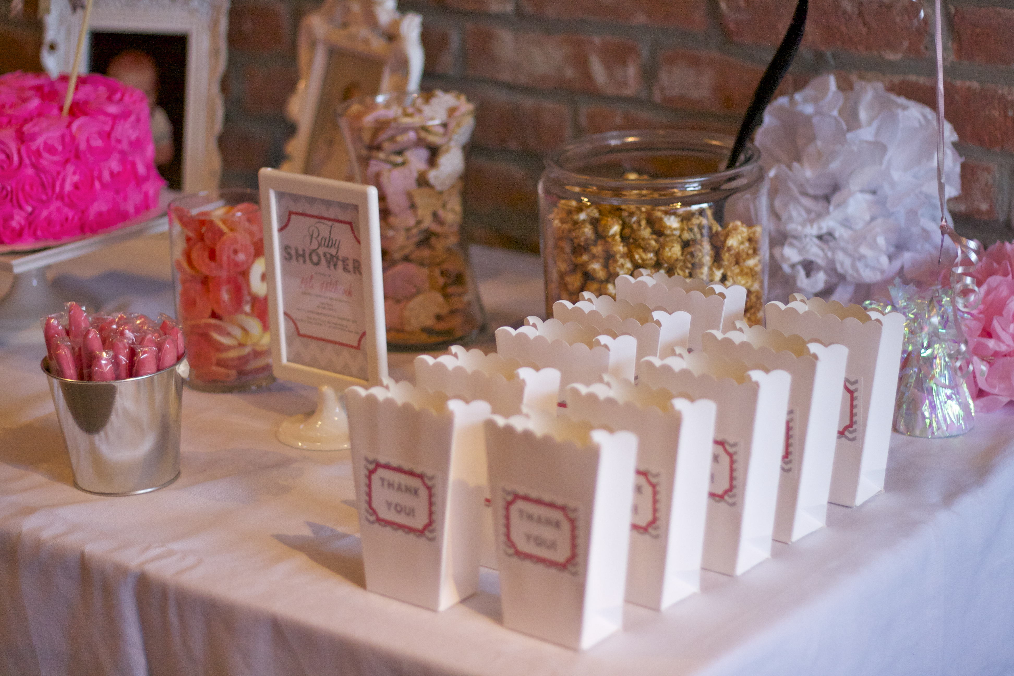 Since food was catered, we focused on dessert and cake for the sweets table. We incorporated some local popcorn, a few of the mother-to-be’s favorite sweets and some labeled popcorn buckets for guests to take the treats home with them.