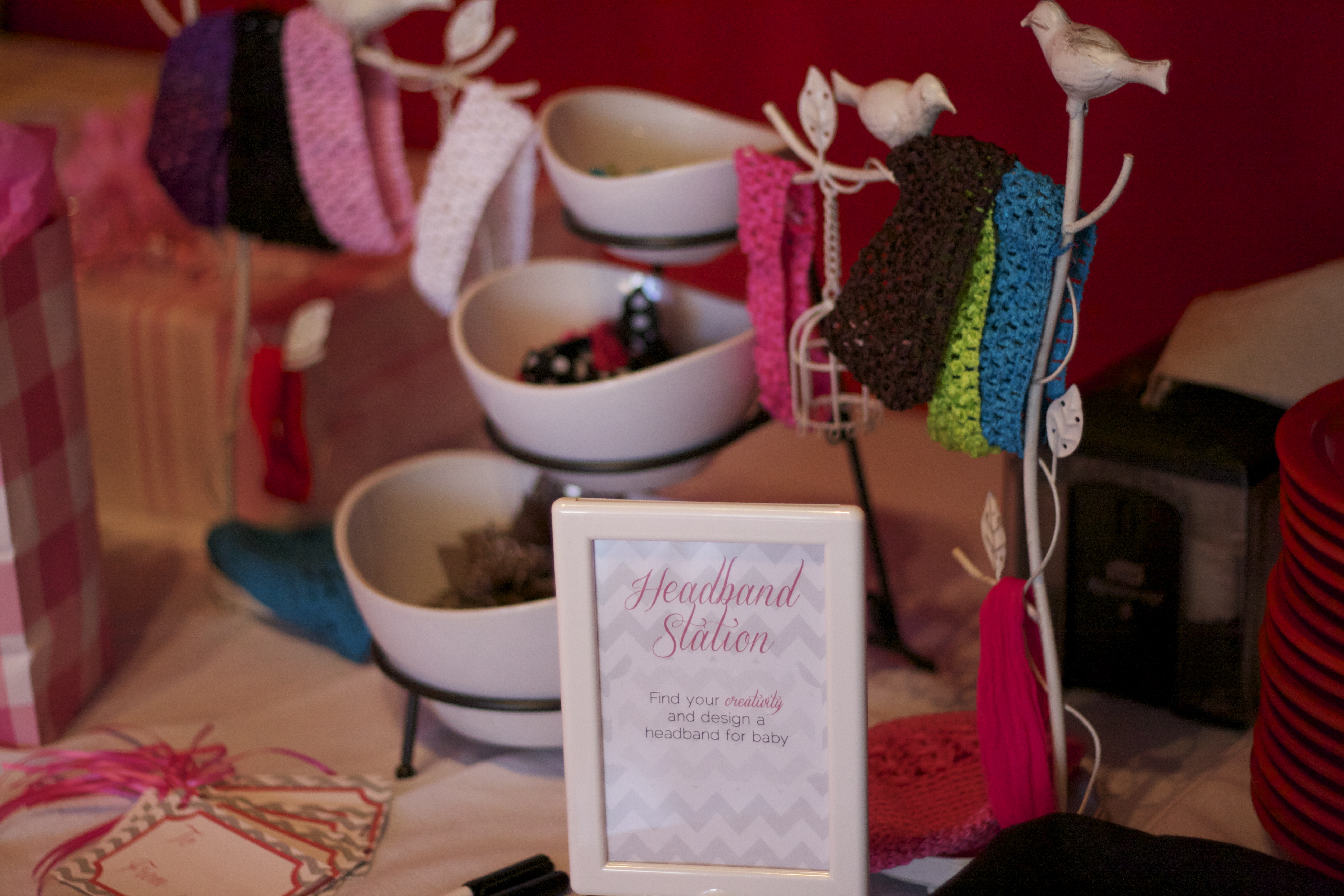My good friend Amanda also had the cute idea of implementing a station so that guests could create a custom headband for Grace to wear. We included some tags so that guests could label the accessory when they were done. It was a hit!