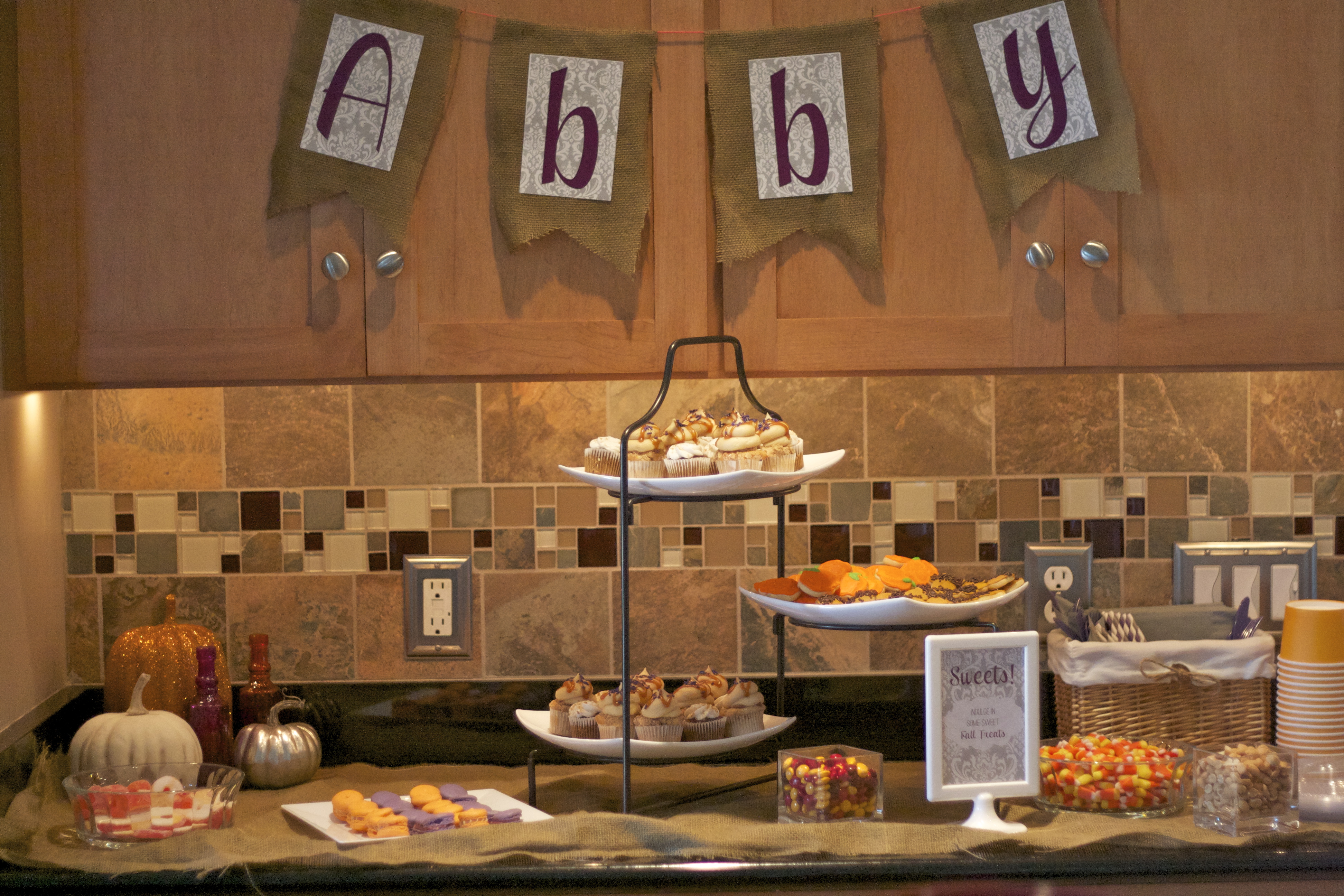 Since sweets are always a must, we set them up on a bar in the kitchen and incorporated Fall treats including caramel apple cupcakes and macaroons from the Confectioneiress bakery in Zionsville, Indiana, candy corn and acorn and pumpkin cookies.