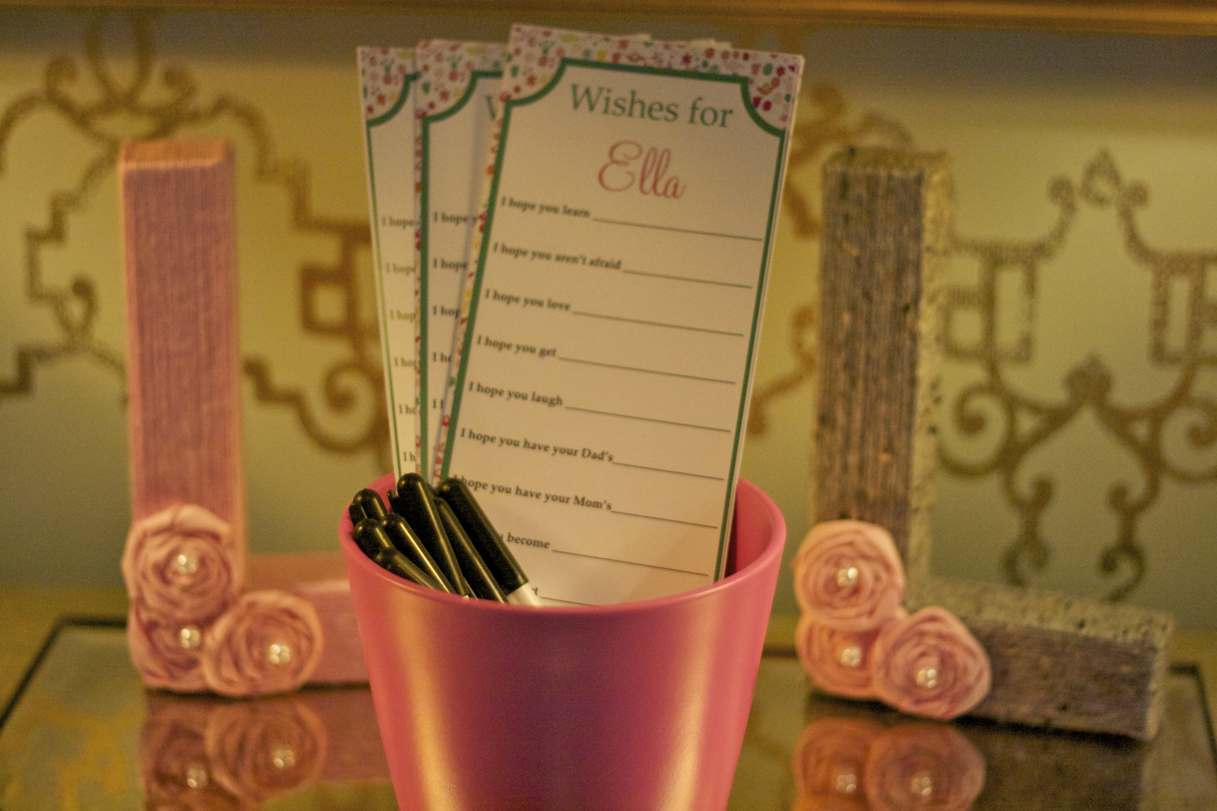 I stole the wishes idea from my cousin’s shower last summer. We had so much fun with it and I thought it would be a great way to involve the guests without making everyone feel like a child with silly games. We used them at each of the showers this season. It’s something the mom-to-be can take with her and read later and it really shows the personality of each guest. Plus, it’s a fun way to add design details throughout the shower, which I love. I have a template I’d be happy to share if you want to comment on this post, otherwise I found this one through a simple search online.