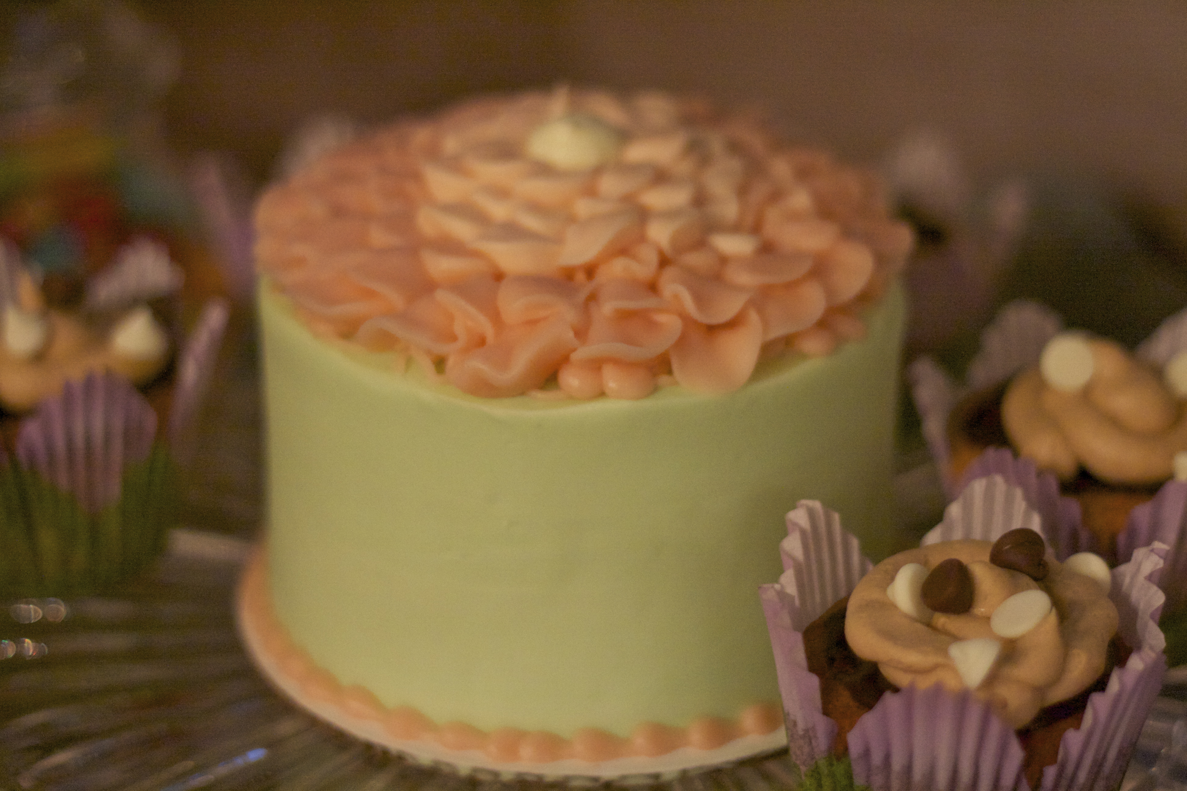 Because my co-host contributed some tasty peanut butter chocolate ganache cupcakes and we had cookies for favors, candy and other sweets, I didn’t want to go overboard on the cake. I do love how they look as a centerpiece however so this was perfect on a number of fronts.