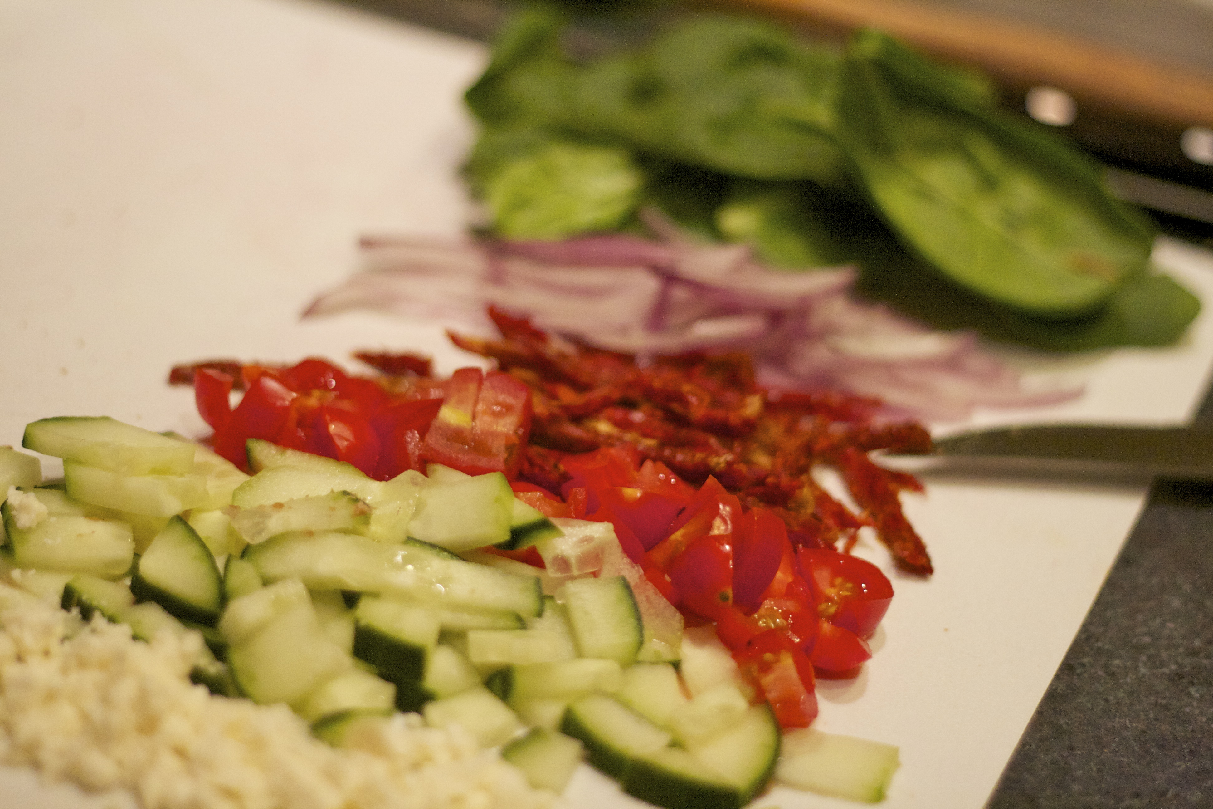 While cooked quinoa is cooling, chop vegetables of your choice and mix up the vinaigrette. I opted to use the same dressing for both the beets and the quinoa salad (adding it to the quinoa when you are ready to serve as it absorbs a lot.