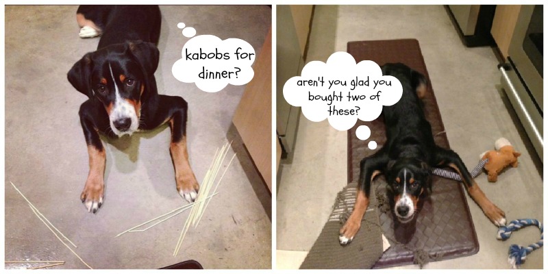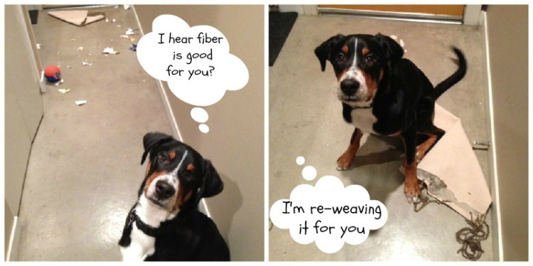 You know that rug I pulled a string out of yesterday, lady? Yeah, well that was your warning. And you left it out for me anyways. Silly Mom. And since the cookbooks didn’t do the trick either, I chewed that rug to pieces just about 10 minutes before you got here. I notice how meticulously you put it back in place every time I move it. Maybe you’ll get the hint now? PS you know it was time for a new one anyway.