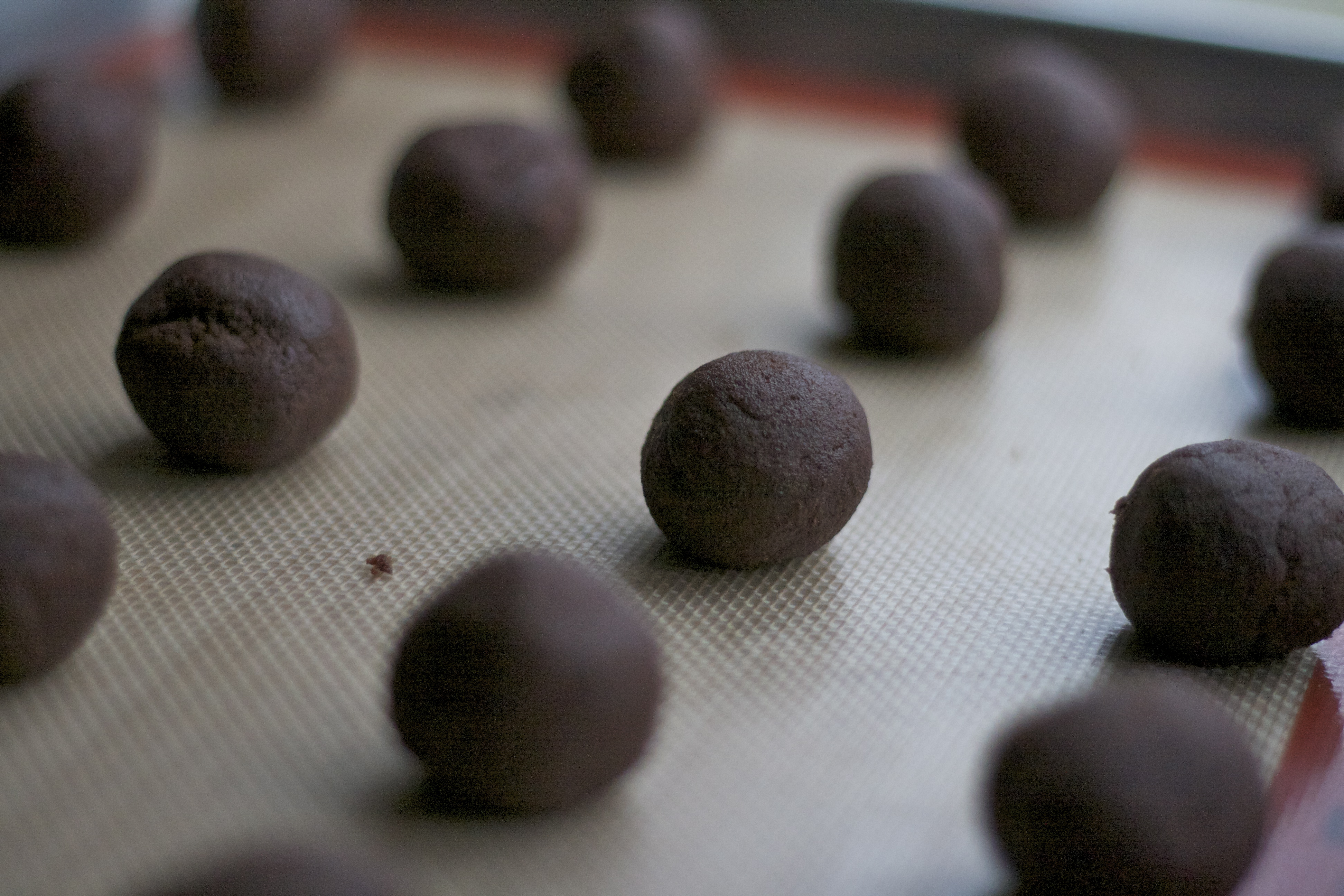 Add dry ingredients into wet until combined. Using a cookie scoop or tablespoon, scoop 1-2 inch sections of dough. Roll into balls and place on non-stick baking mat on cool pan.