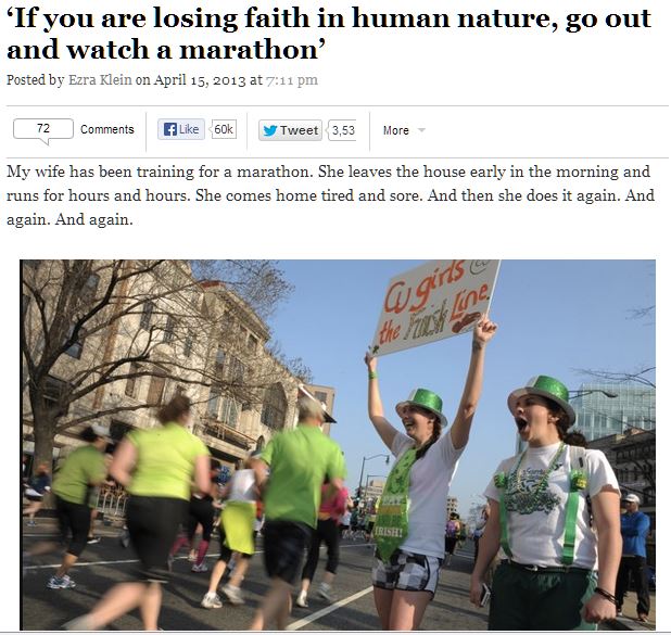 I read this blog post shortly after the tragedy in Boston and it really resonated with me. The author references this quote from first woman to run Boston, Kathrine Switzer.