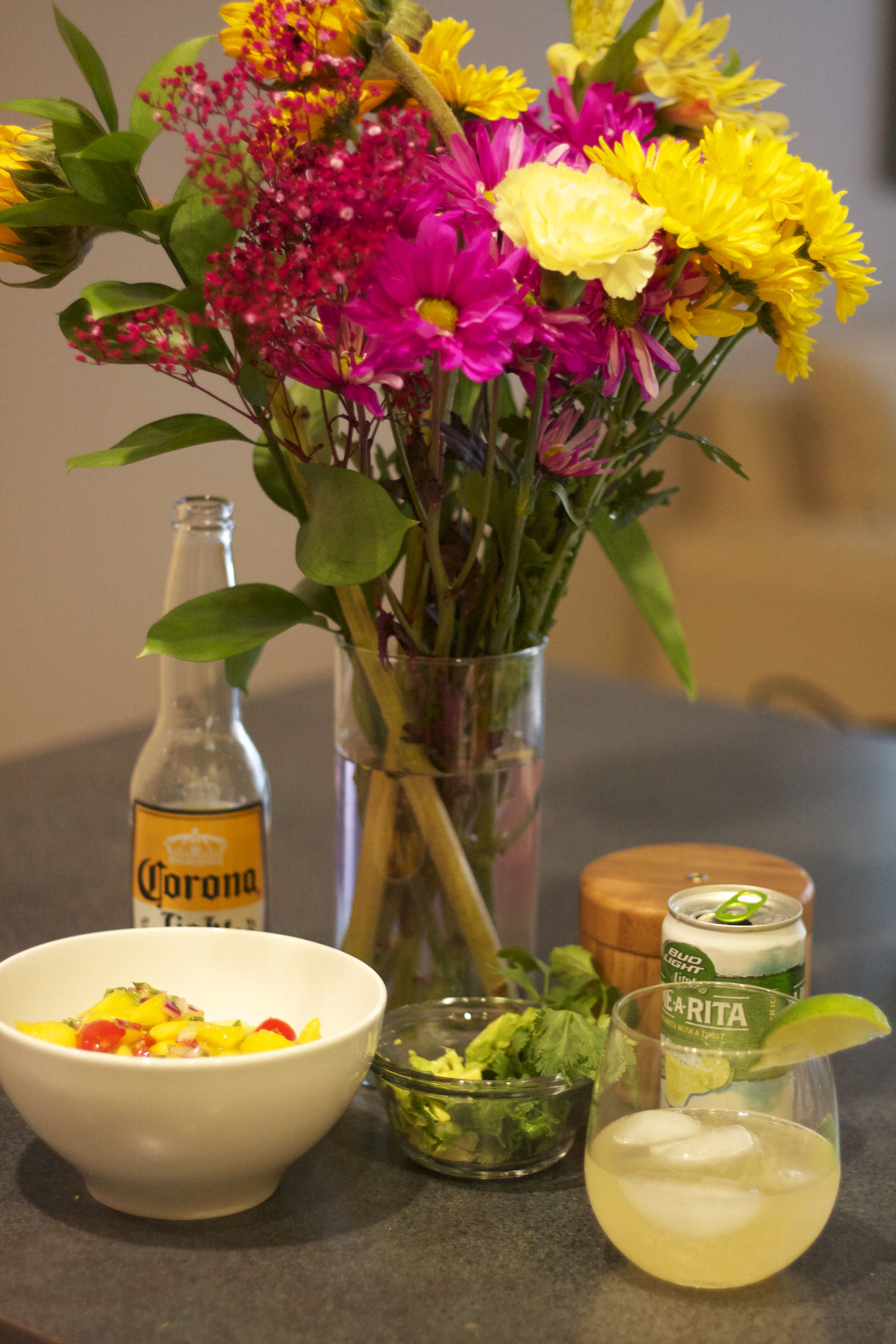 I was pretty fiesta’d out by Sunday evening but my managed to throw together a little Cinco De Mayo meal to round out the weekend. Mangoes are finally back so we grilled shrimp and tilapia and served it with one of my favorite mango salsas.