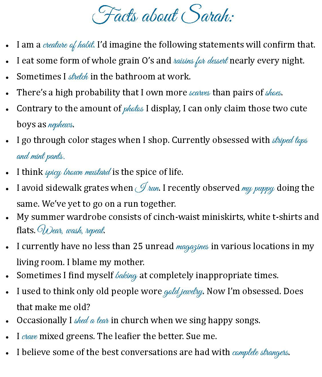 I know it’s hard to believe seeing as how most of this blog is dedicated to observations about my life, but when it came to making a list of items to help strangers get to know me as a person, I actually had a hard time writing them down. I got a little overwhelmed thinking that the throngs of visitors the few new visitors that came across the page might judge me based on the list.