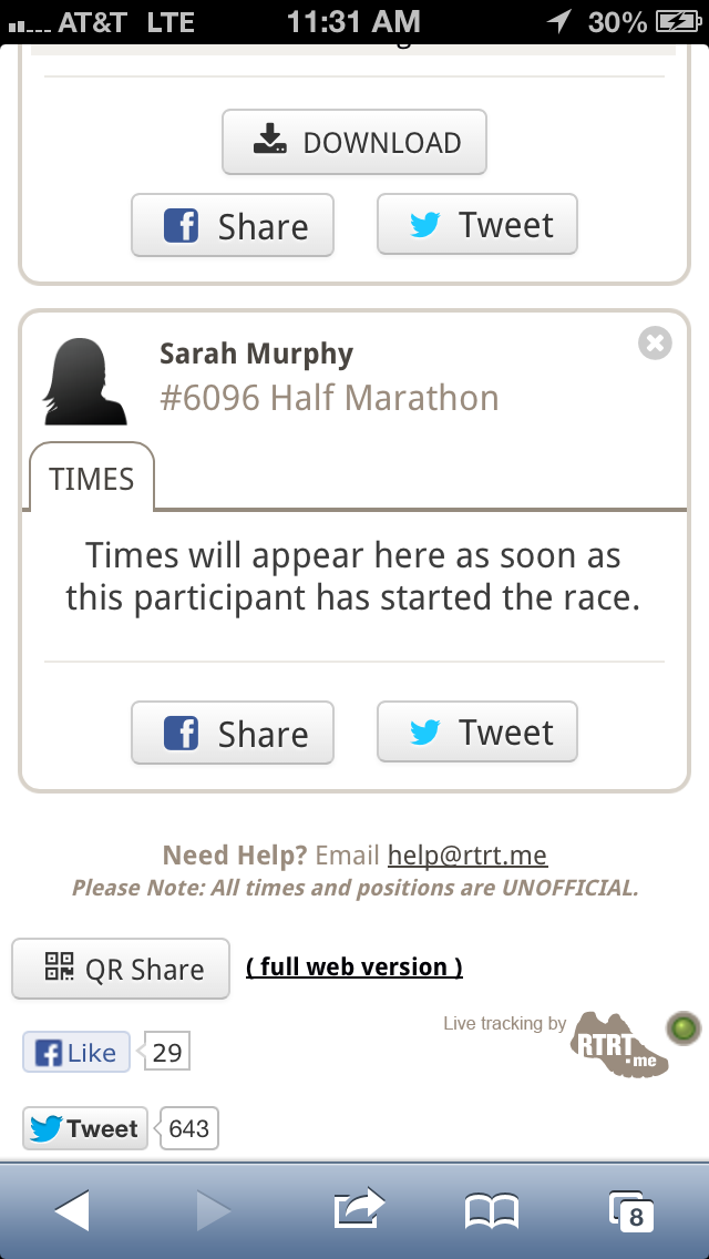 And so wraps half marathon #6. Anyone who tells you they get easier each time 1) Probably ran one more than 4 days ago or 2) likes running in hot weather like crazy man Matt. Speaking of Matt, he crushed his PR. As for careful Sarah who always makes sure to make a perfect loop and properly secure her D-Tag to her shoe? Well, this is what she saw when she checked to see if she too broke her PR: