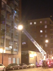 Fortunately the fire was small and contained to a balcony on the opposite side of the building. It was out within 20 minutes, but left just enough time for a crowd to gather to watch the guys do their thing.
