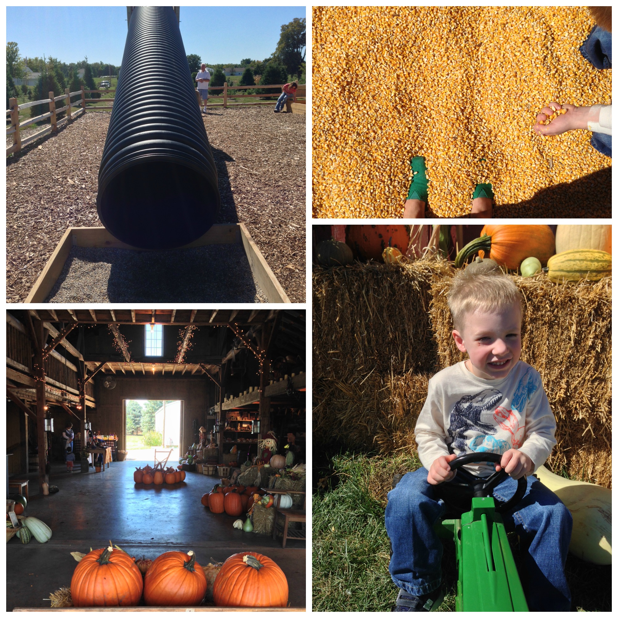 We started our adventure at the barn where Jake proceeded to ride the ‘for photos only’ tractor away from it’s location over and over. Then we moved over to the playground where they had a series of unique slides, swings and corn boxes.