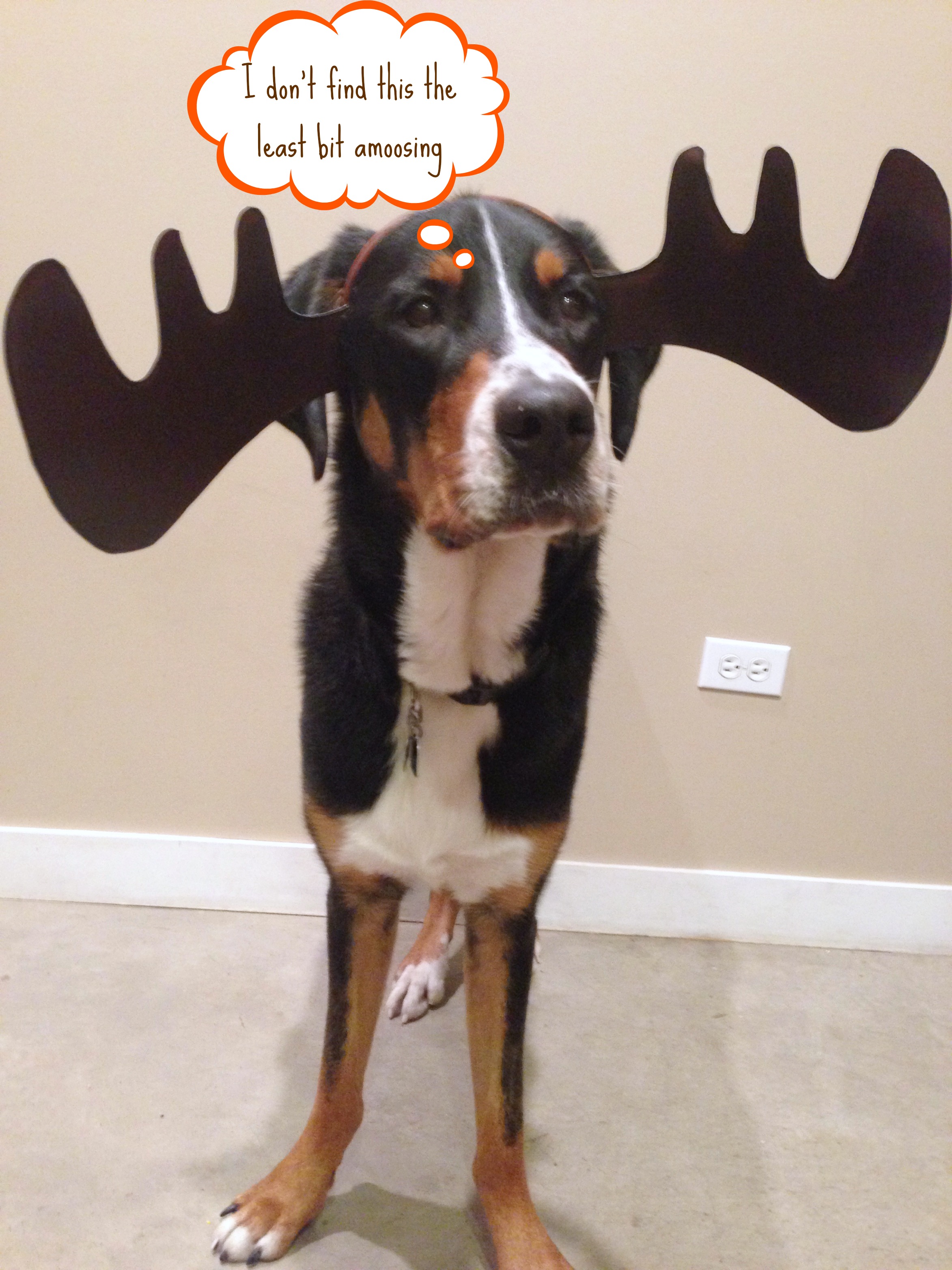 I thought it was fitting because he is awkwardly tall and clumsy. He chewed them off approximately 5 seconds after this photo was taken, but as of this morning, Finn the Moose has more likes on Facebook than a marathon finisher. And with a lot less effort!