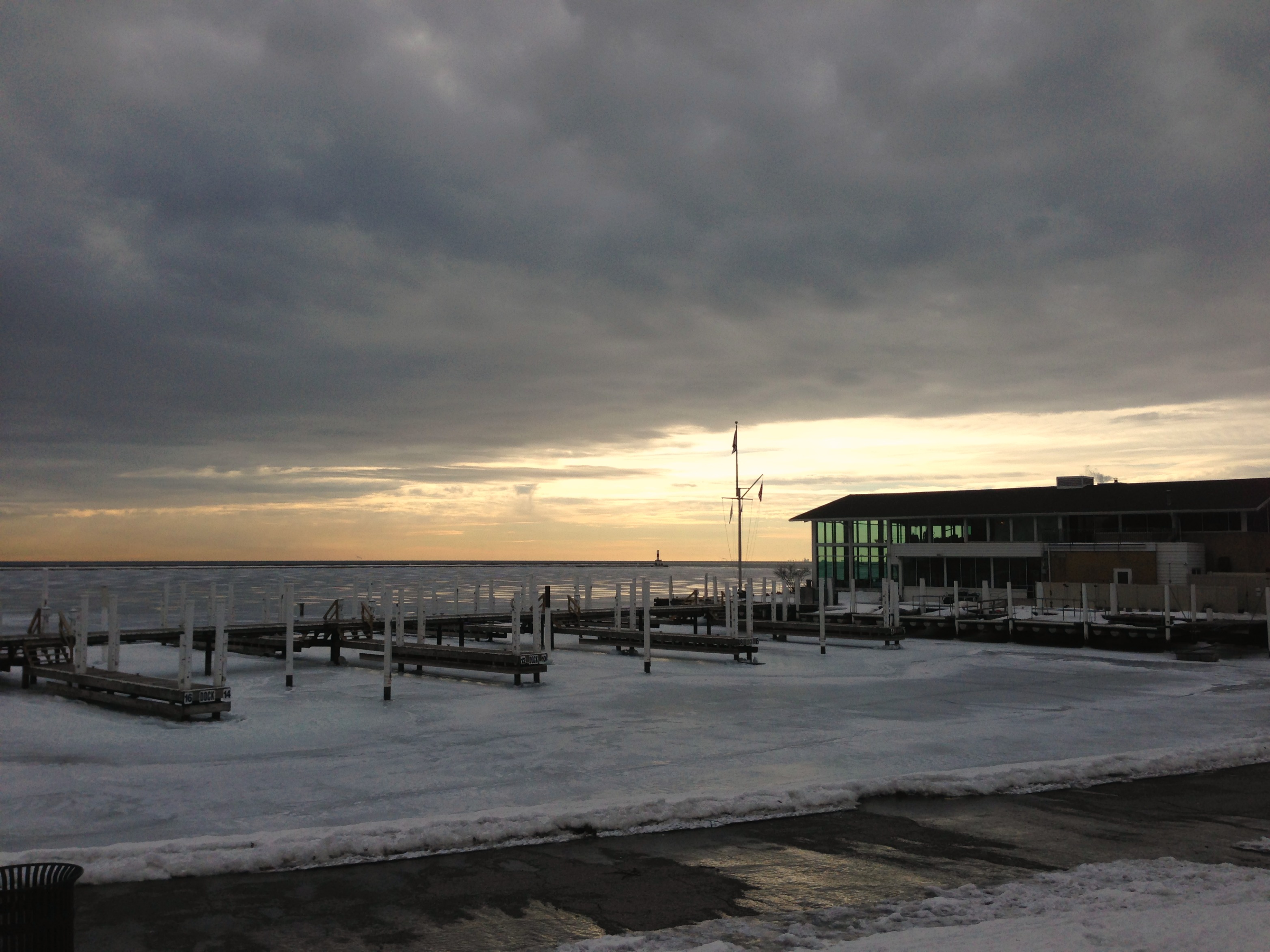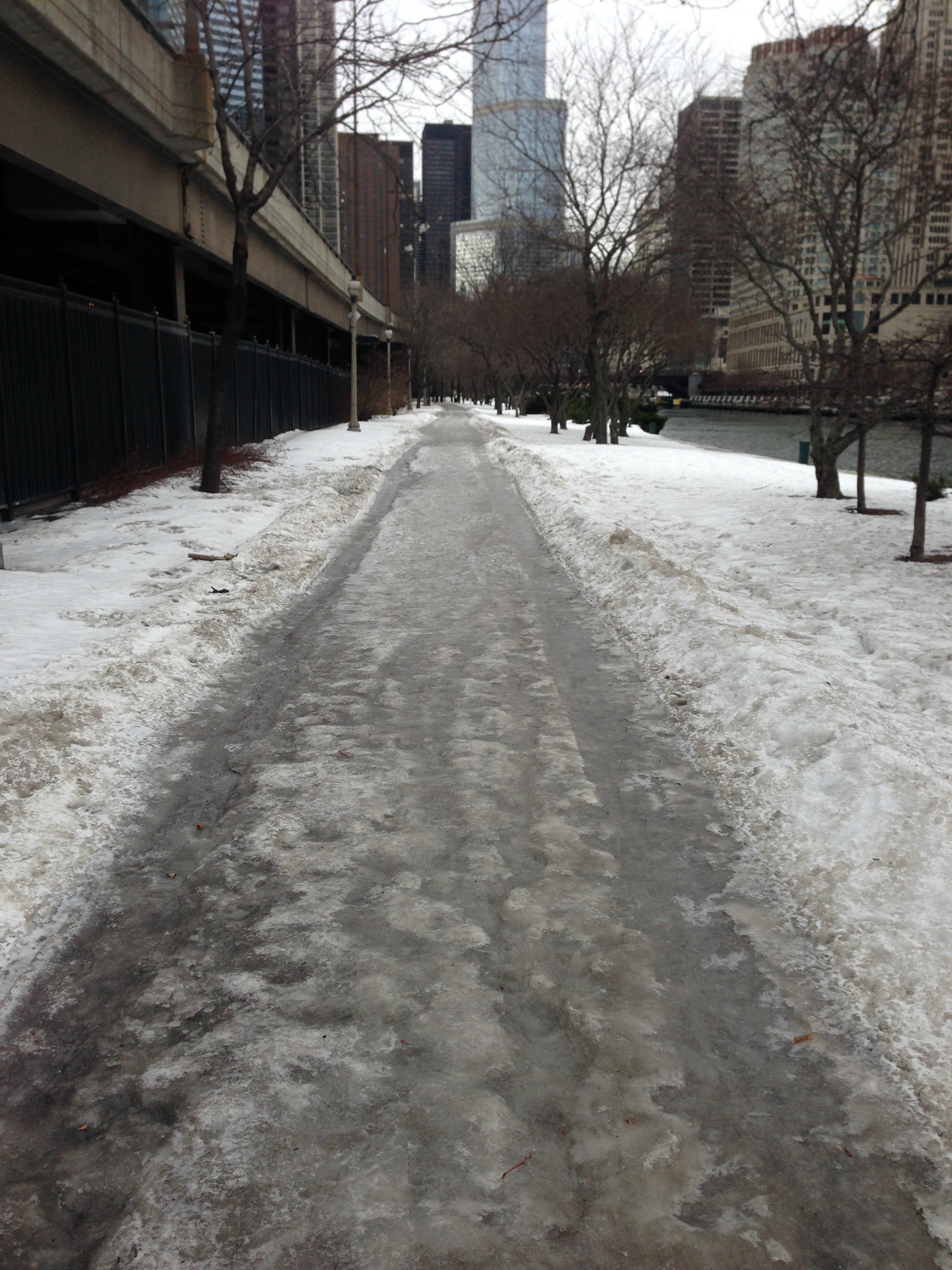 Hit the Riverwalk. Literally, with your backside. And don’t give up when you see the first portion is icier than the cube at Sochi. You’ve already made it this far. Follow the frozen footprints that a much taller stranger left several days prior for the next half a mile. It’s just like doing lunges really.