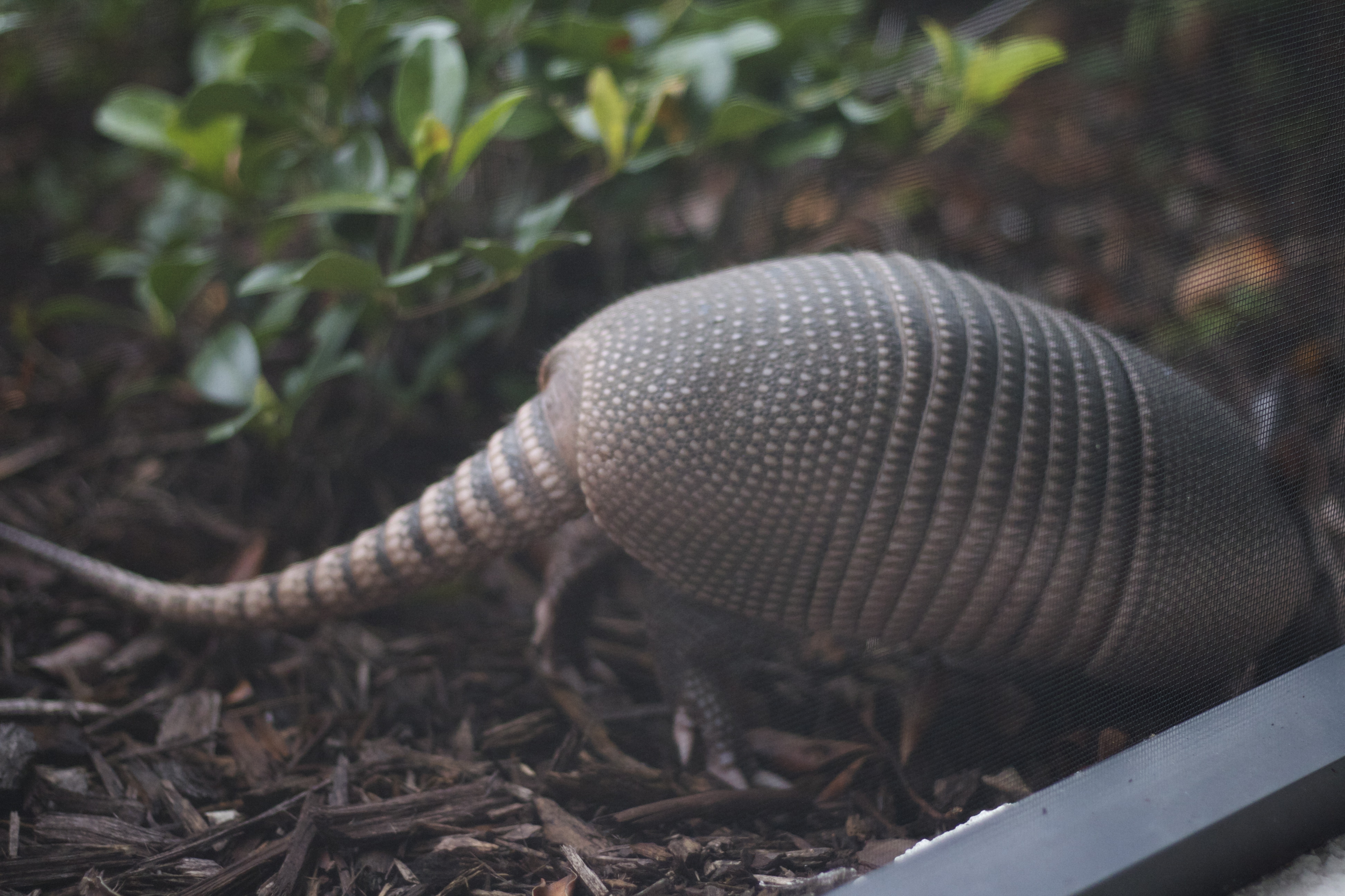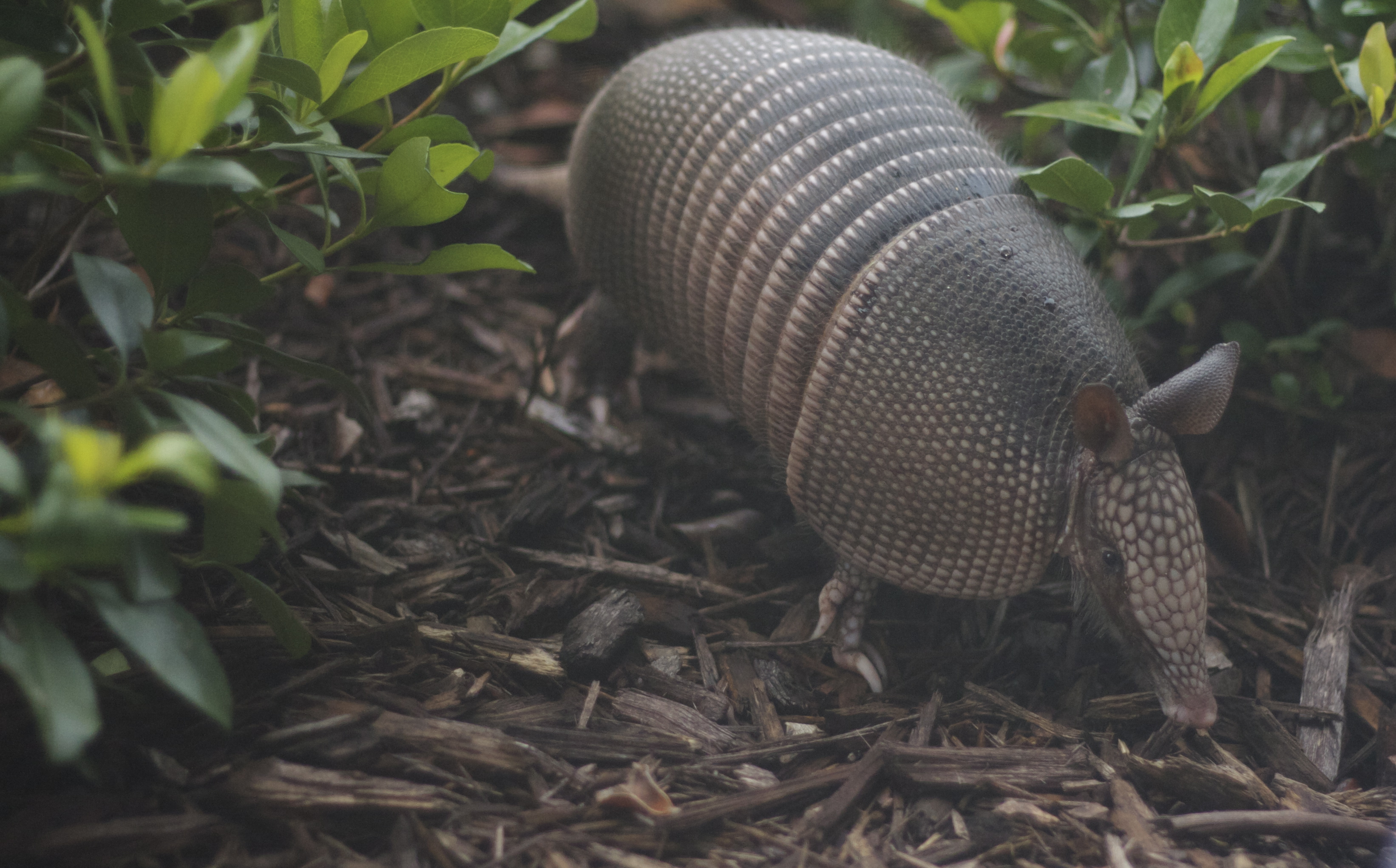 Armadillos are not native to Florida, but are now common over most of the state. Armadillos like forested or semi-open habitats with loose textured soil that allows them to dig easily. They eat many insects, or other invertebrates, and some plants. They most often feed at night, and have very poor eyesight. (source)