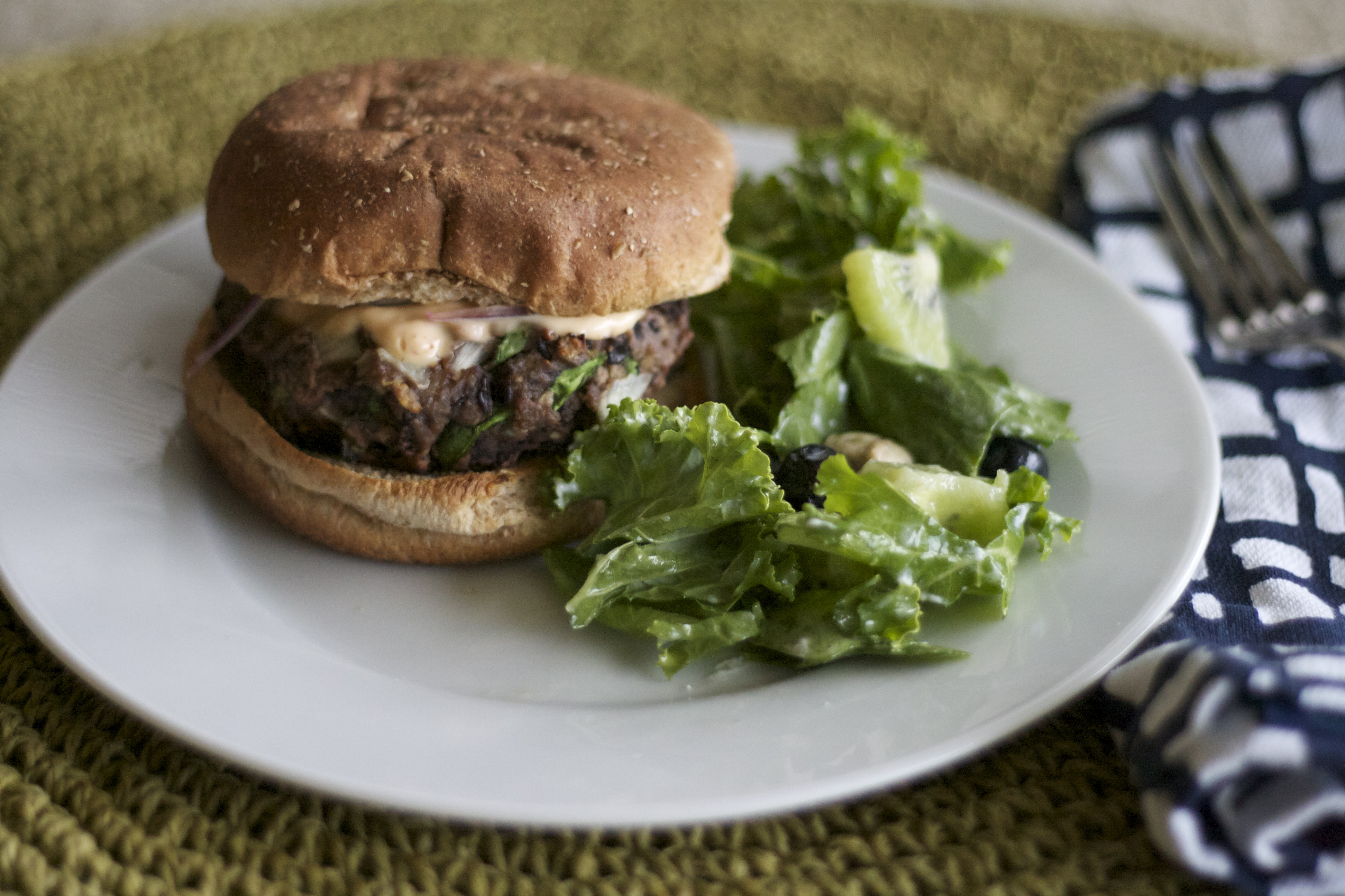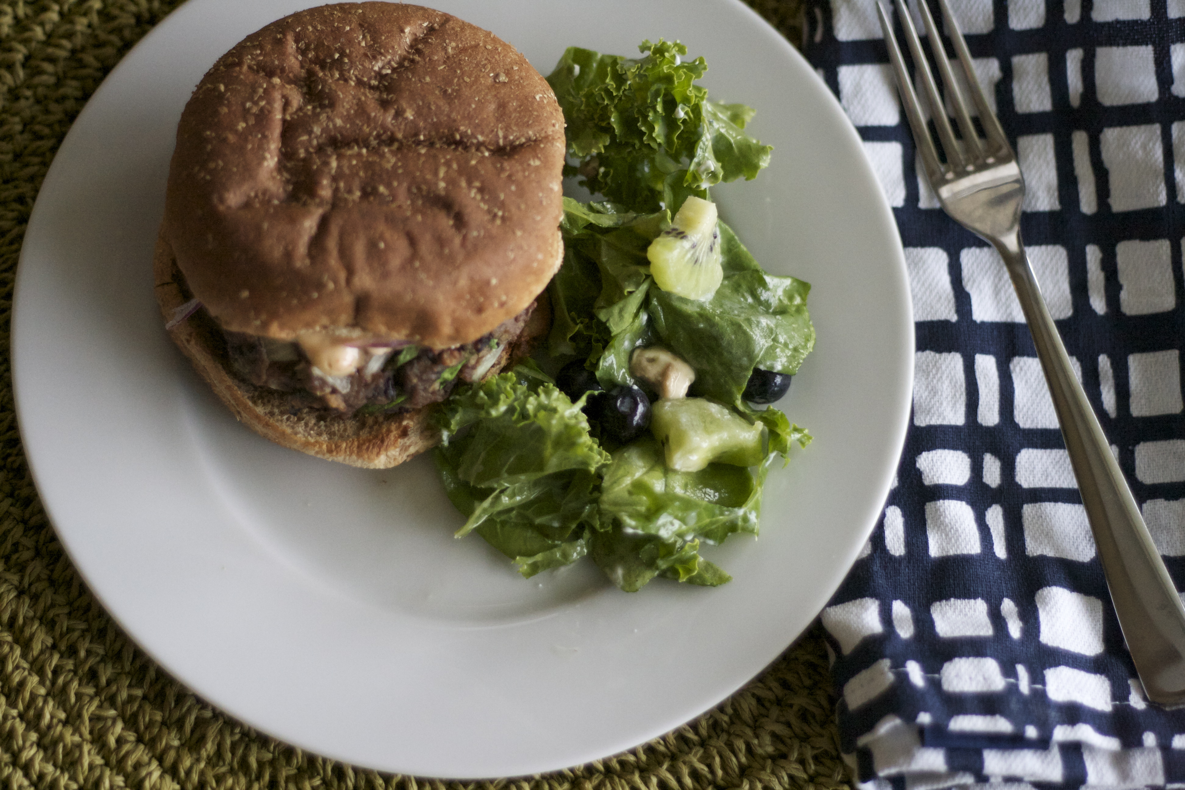 Serve on whole wheat hamburger buns and garnish with a dollop of sriracha aioli and a kale salad with kiwi, blueberries and a white balsamic vinaigrette.