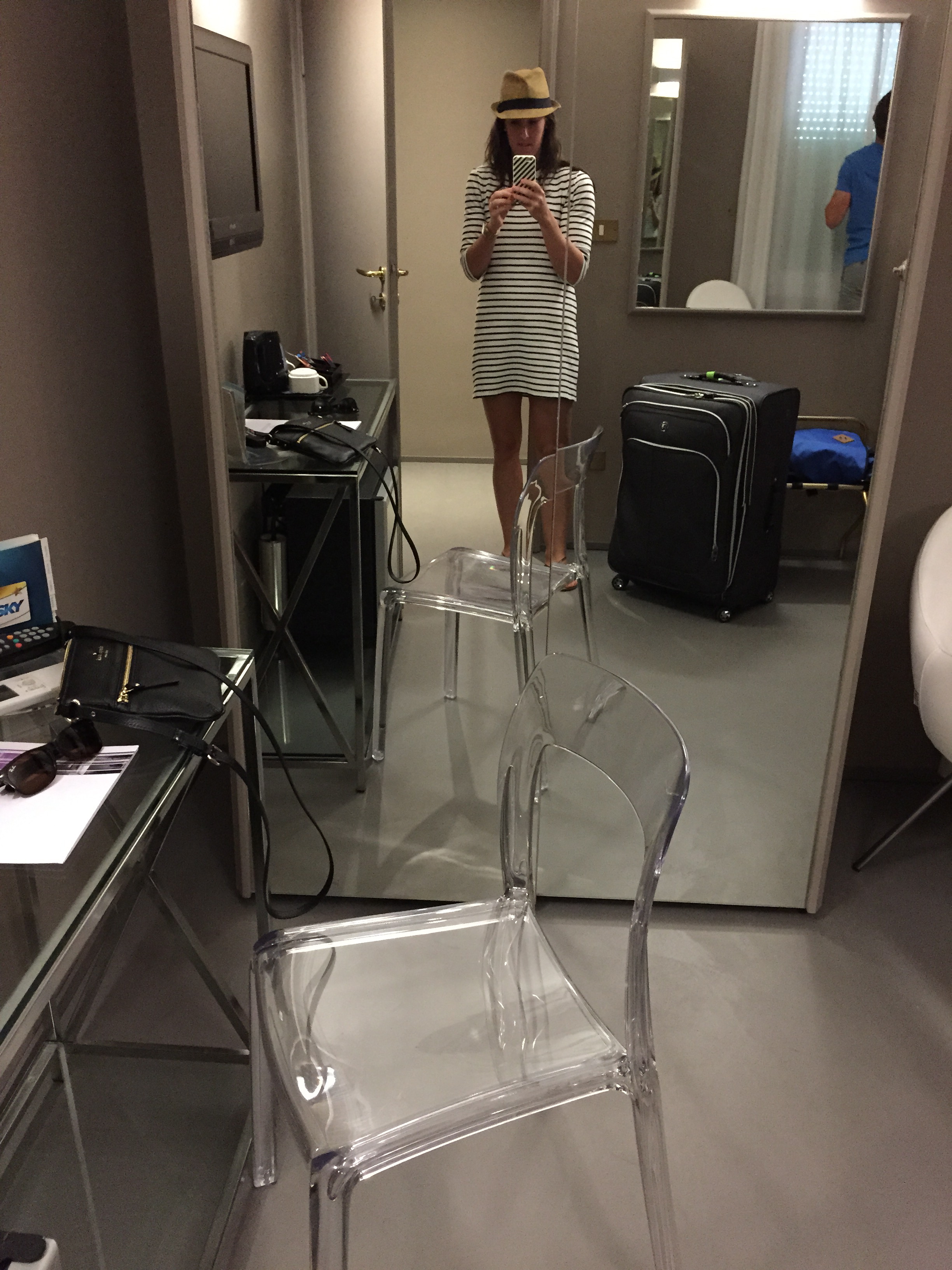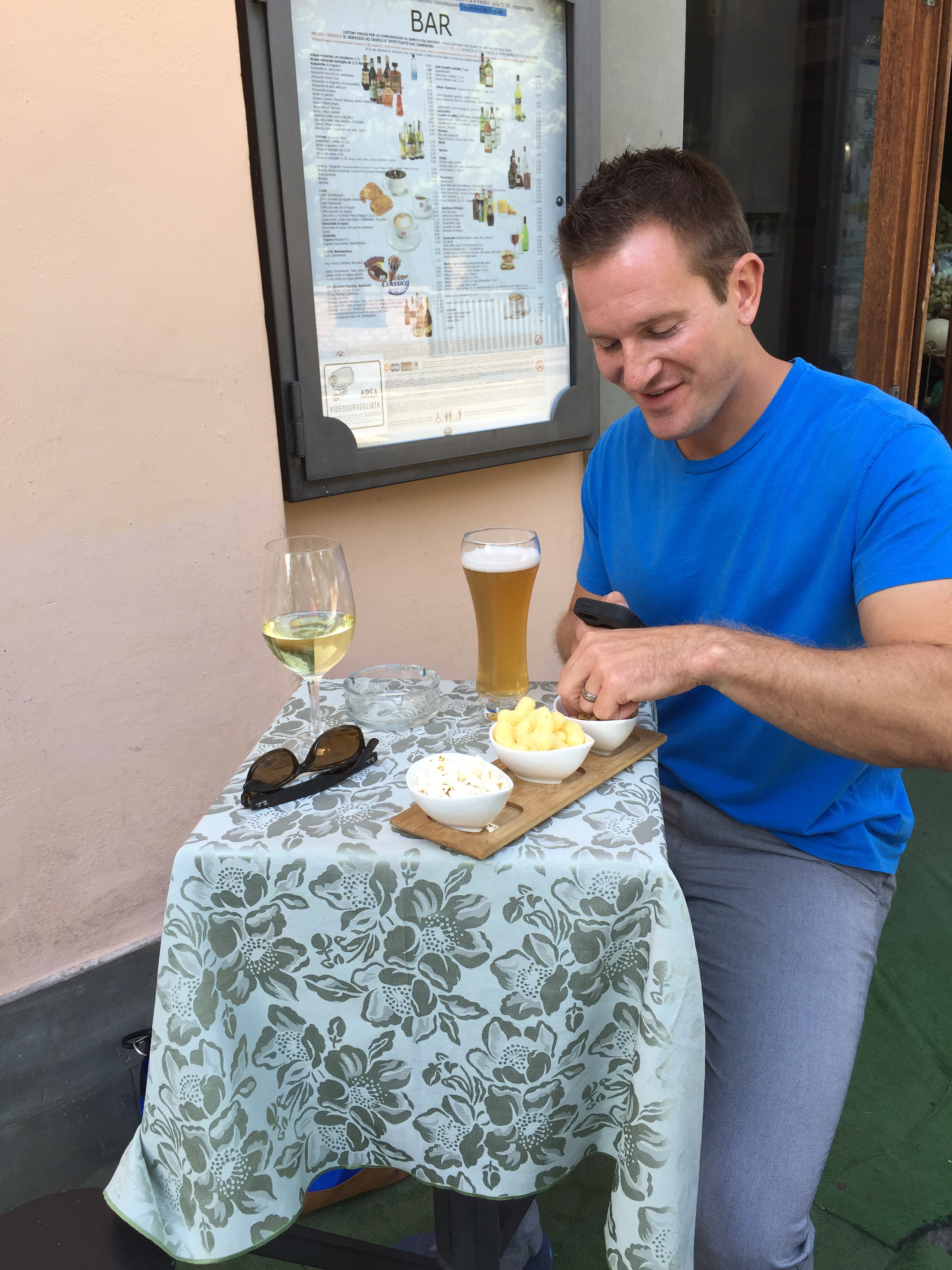 It was at the top of San Luca that we had our first aperitivo on the trip. Partially pictured: the tiny round teeter-totter that was the seat at this quaint pizzeria.