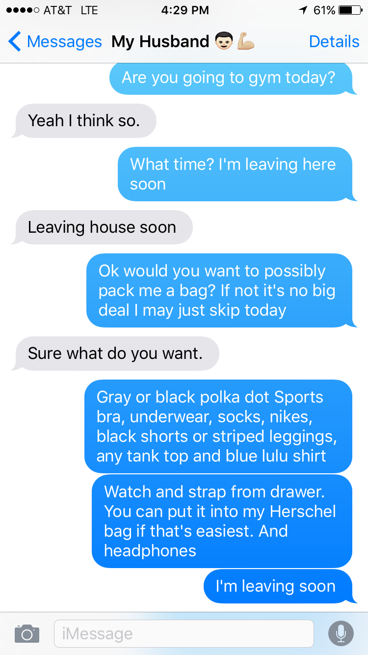 Simple enough right? Not for the well-prepared man. Because this man I married will take no chance that I will not have enough supplies in that bag to make it through a light workout, or climb Mt. Kilimanjaro.