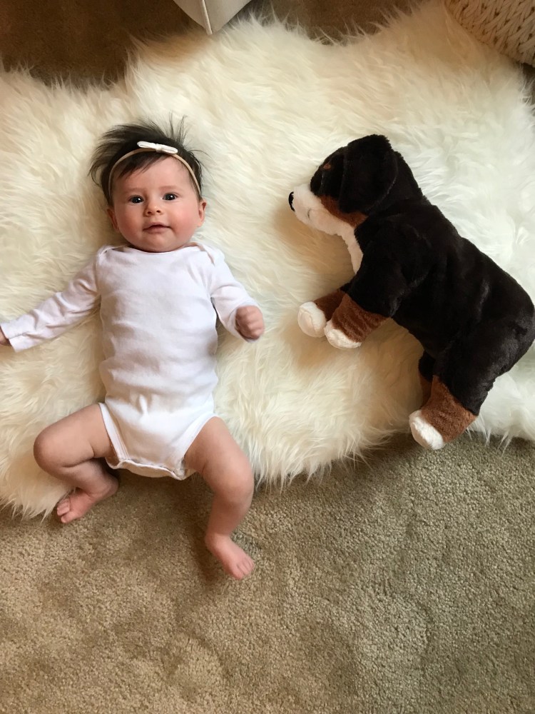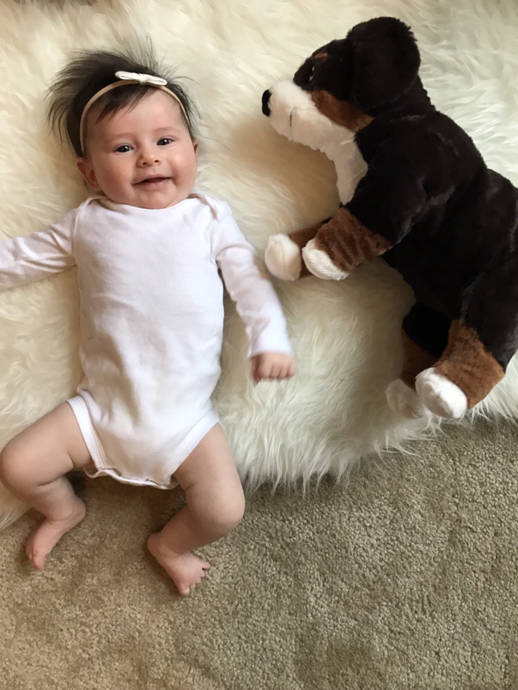 Big fan of: Trying to stand up like a big kid, blowing out her diapers, holding her head up, starting to smile for dad, the winter olympics and spitting up as soon as you tighten her car seat.